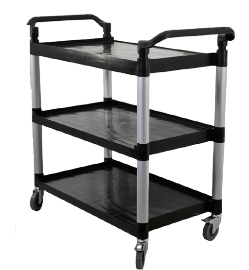 (43069) Bussing Cart, 40" H, 3 shelf, (2) handles, includes: 19-1/2" x 31" tray size, (4) swivel casters two with locks, plastic, black